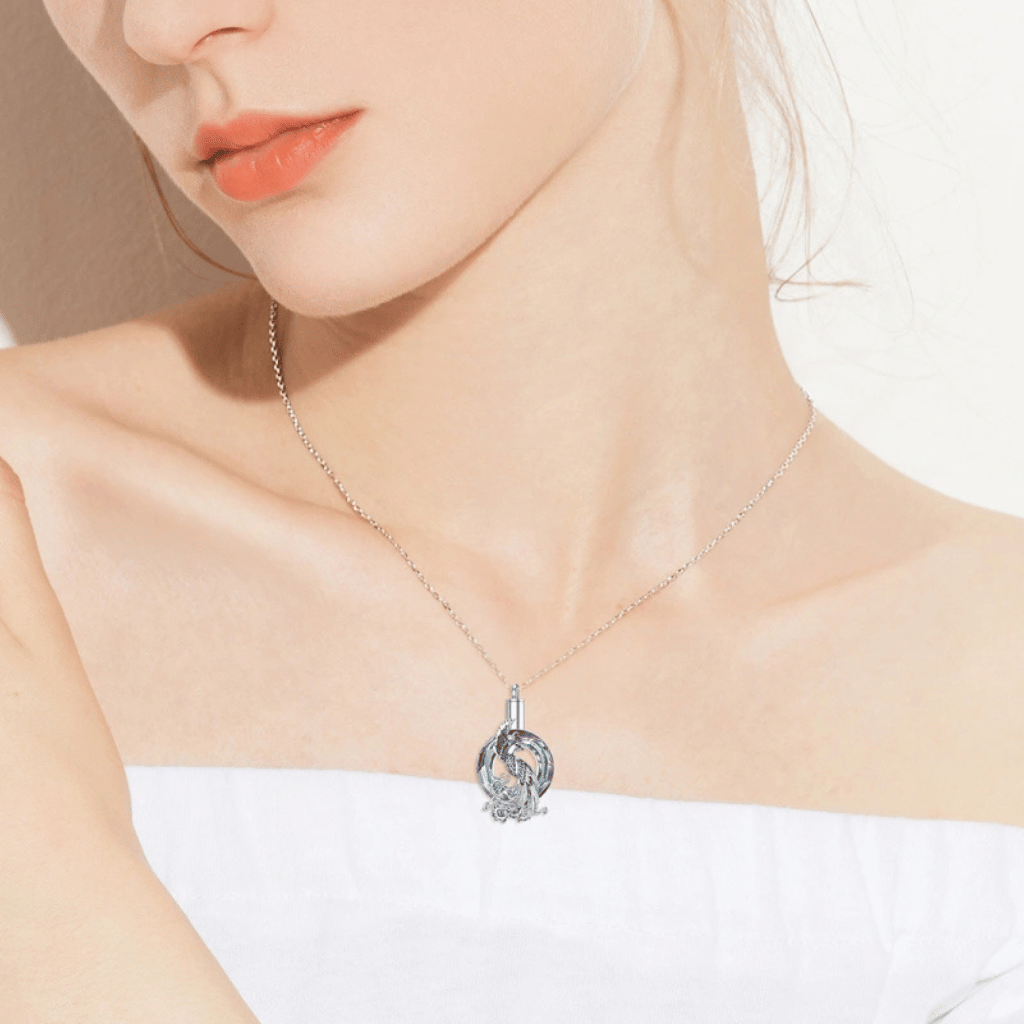A sterling silver cremation necklace featuring a blue and purple Swarovski crystal wreath with a silver peacock