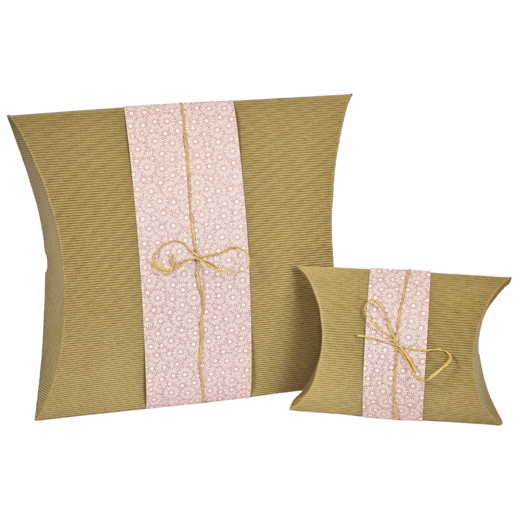 A biodegradable bamboo urn featuring a paper band with multiple pink flowers and lace to tie it together. This urn comes with an additional biodegradable starch bag to hold the ashes inside and is available in two different sizes
