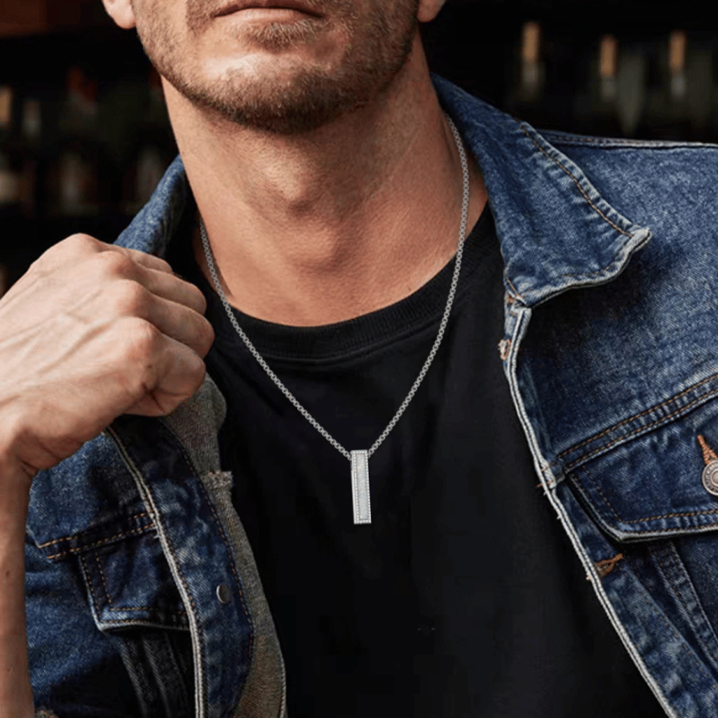 A sterling silver cremation necklace featuring a rectangular opal design with cubic zirconia surrounding