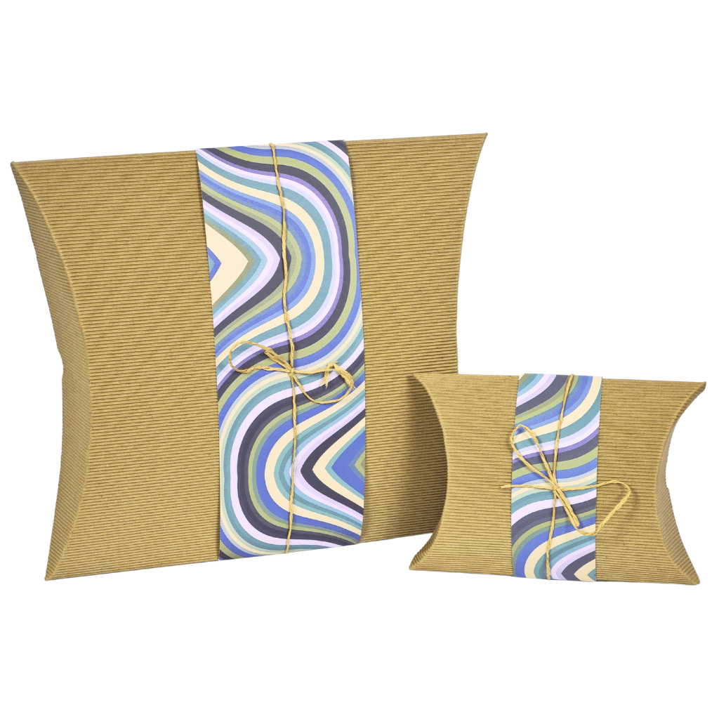 A biodegradable bamboo urn featuring a paper band with coloured, wavy lines design and lace to tie it together. This urn comes with an additional biodegradable starch bag to hold the ashes inside and is available in two different sizes