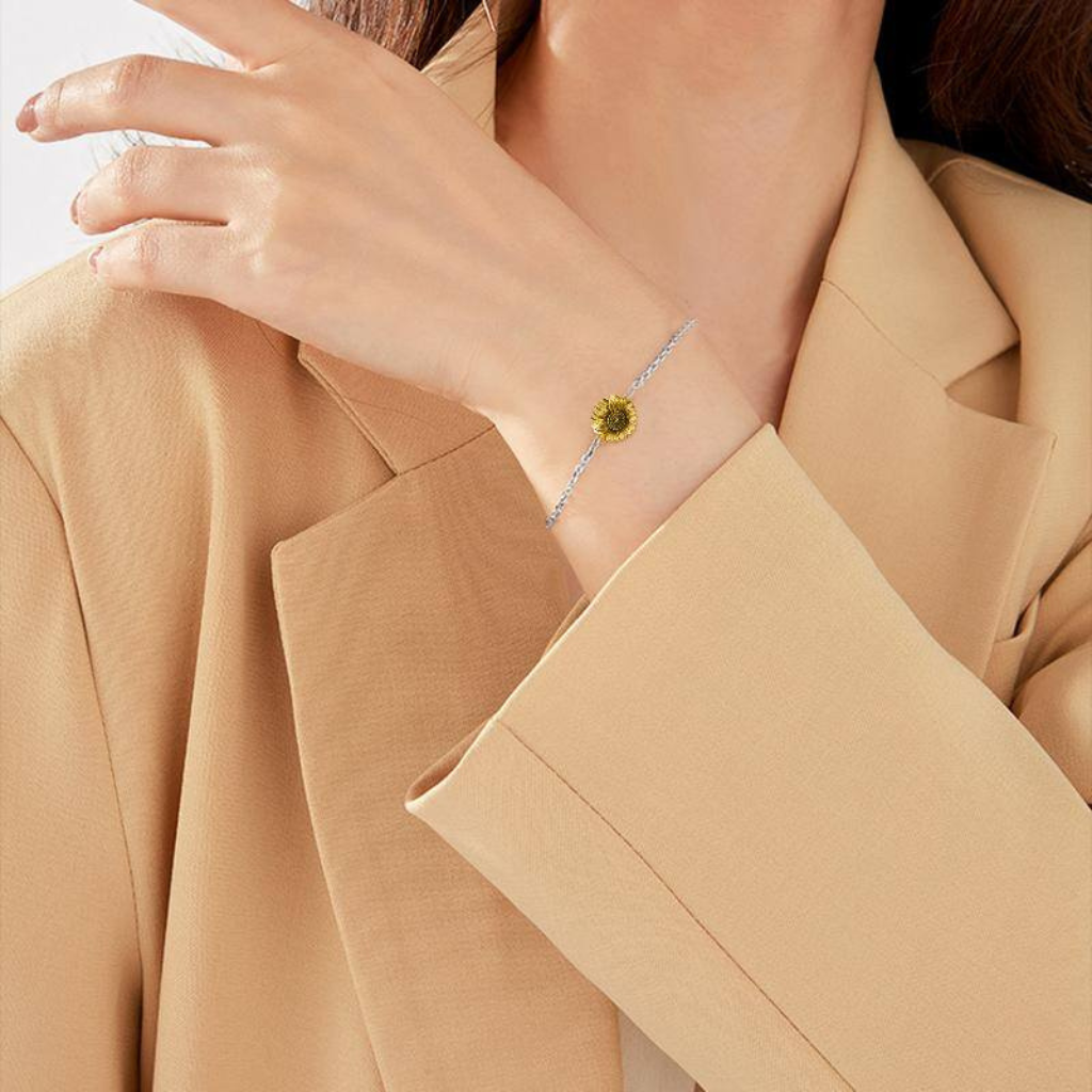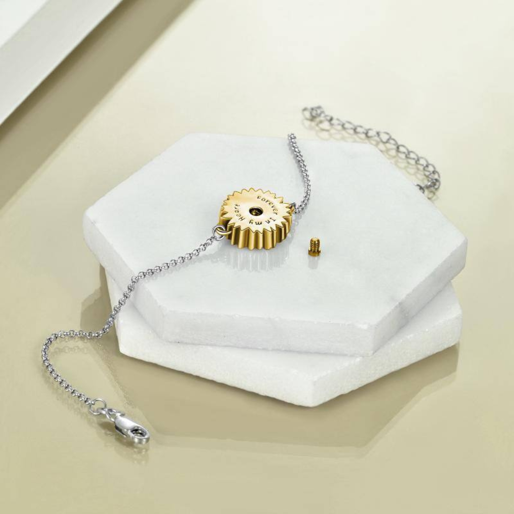 A sterling silver cremation bracelet featuring a gold plated sunflower charm